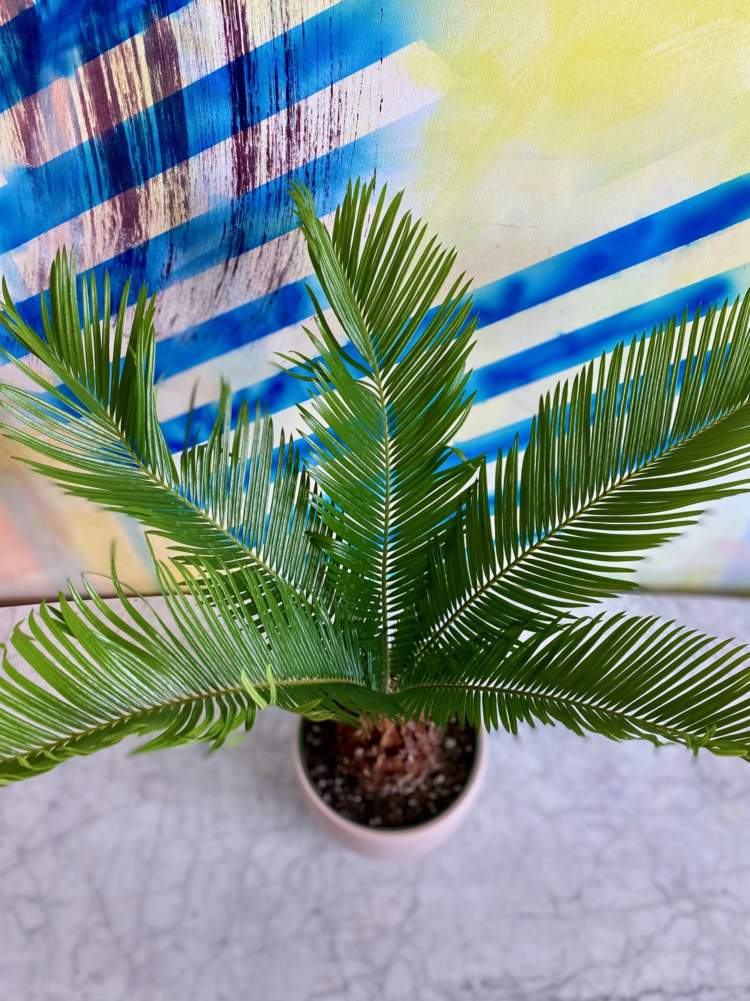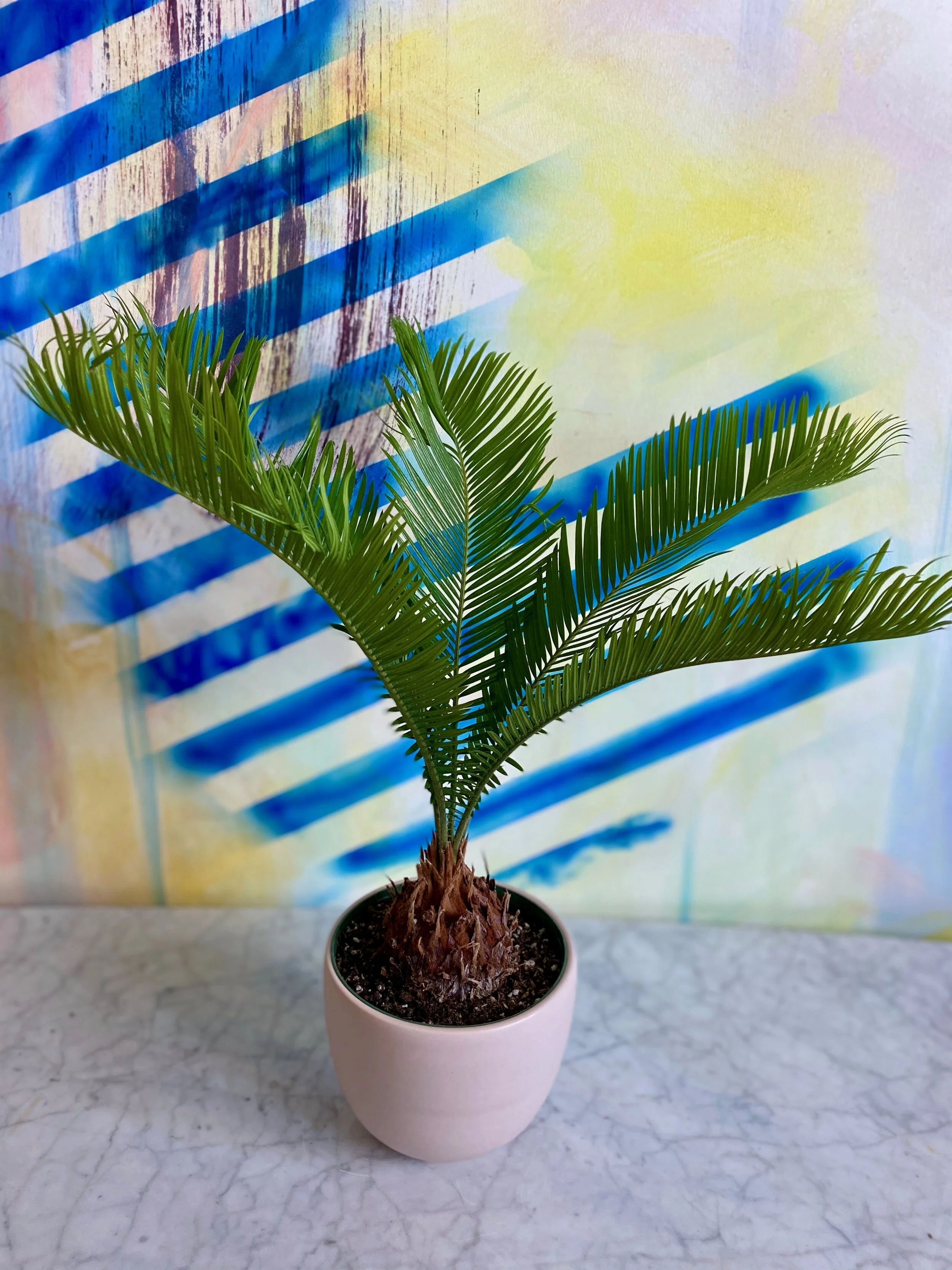This arrangement is all about textures and colors. The highly textured Hens and Chicks Sempervivum has cool green leaves with rosy red center that ties together the arrangment. The red Euphorbia trigona with its vertical lines and flat oval leaves contrast the soft fuzzy leaves and cool grey color of the Kalanchoe Tomentosa.
