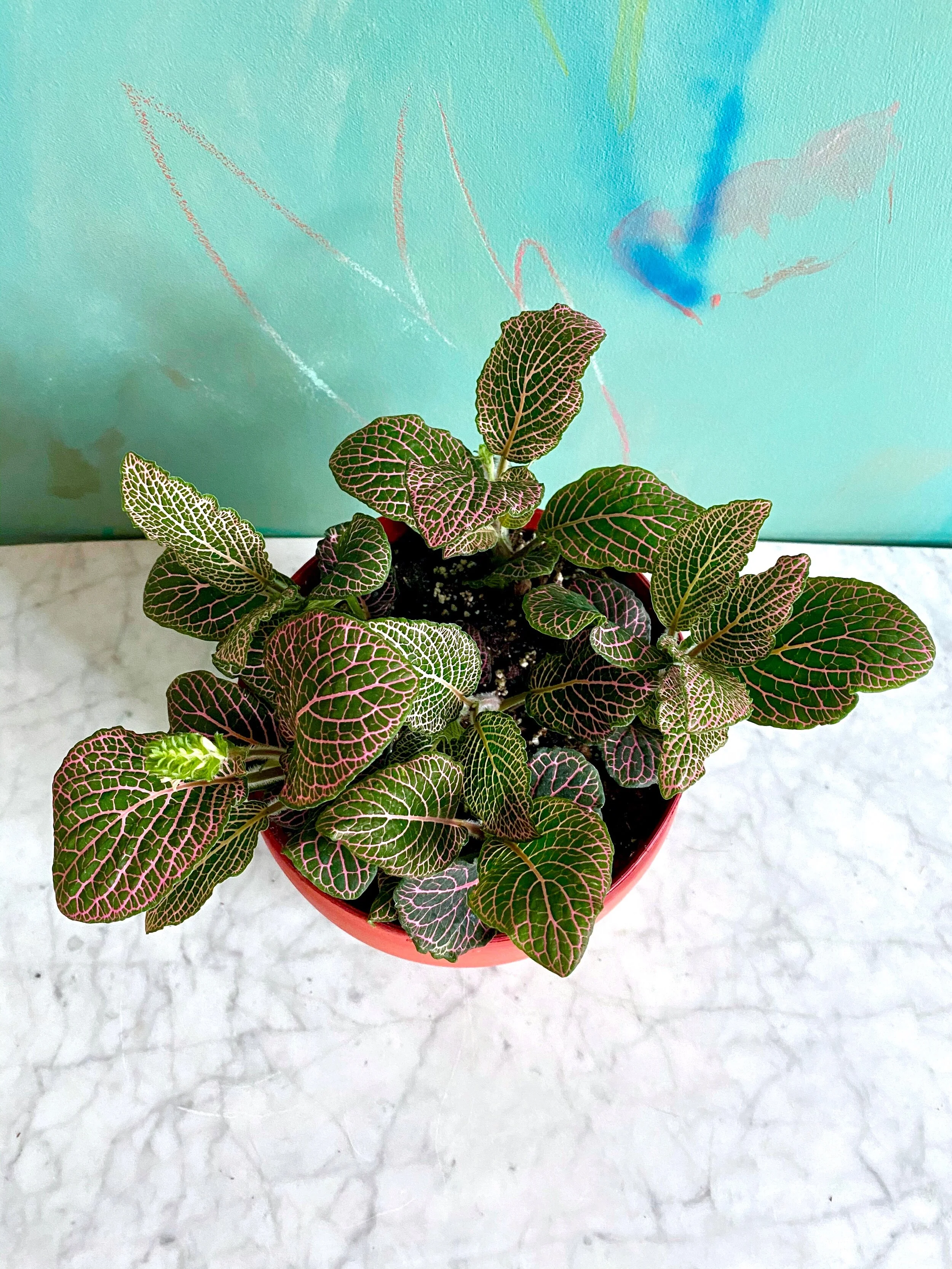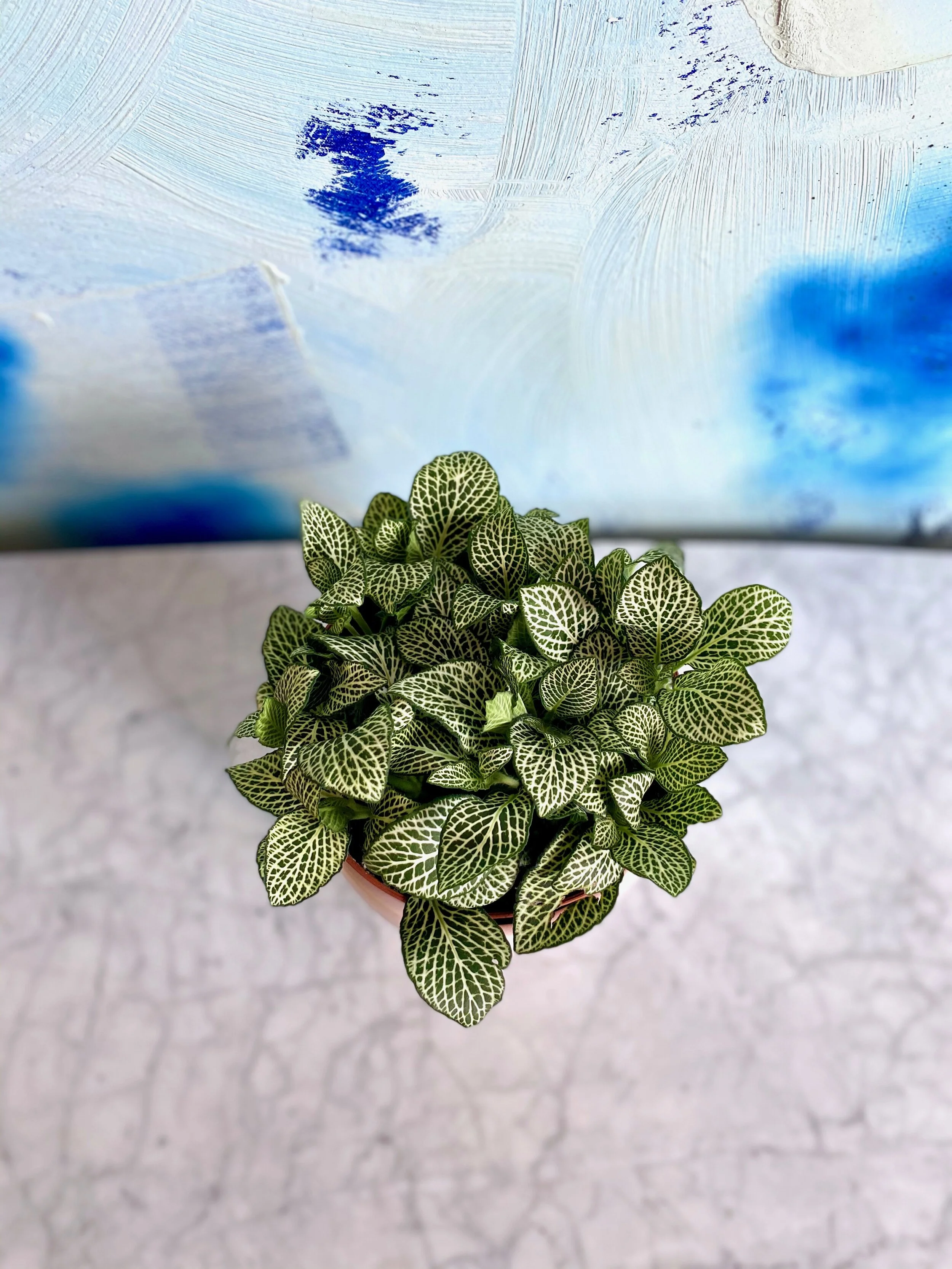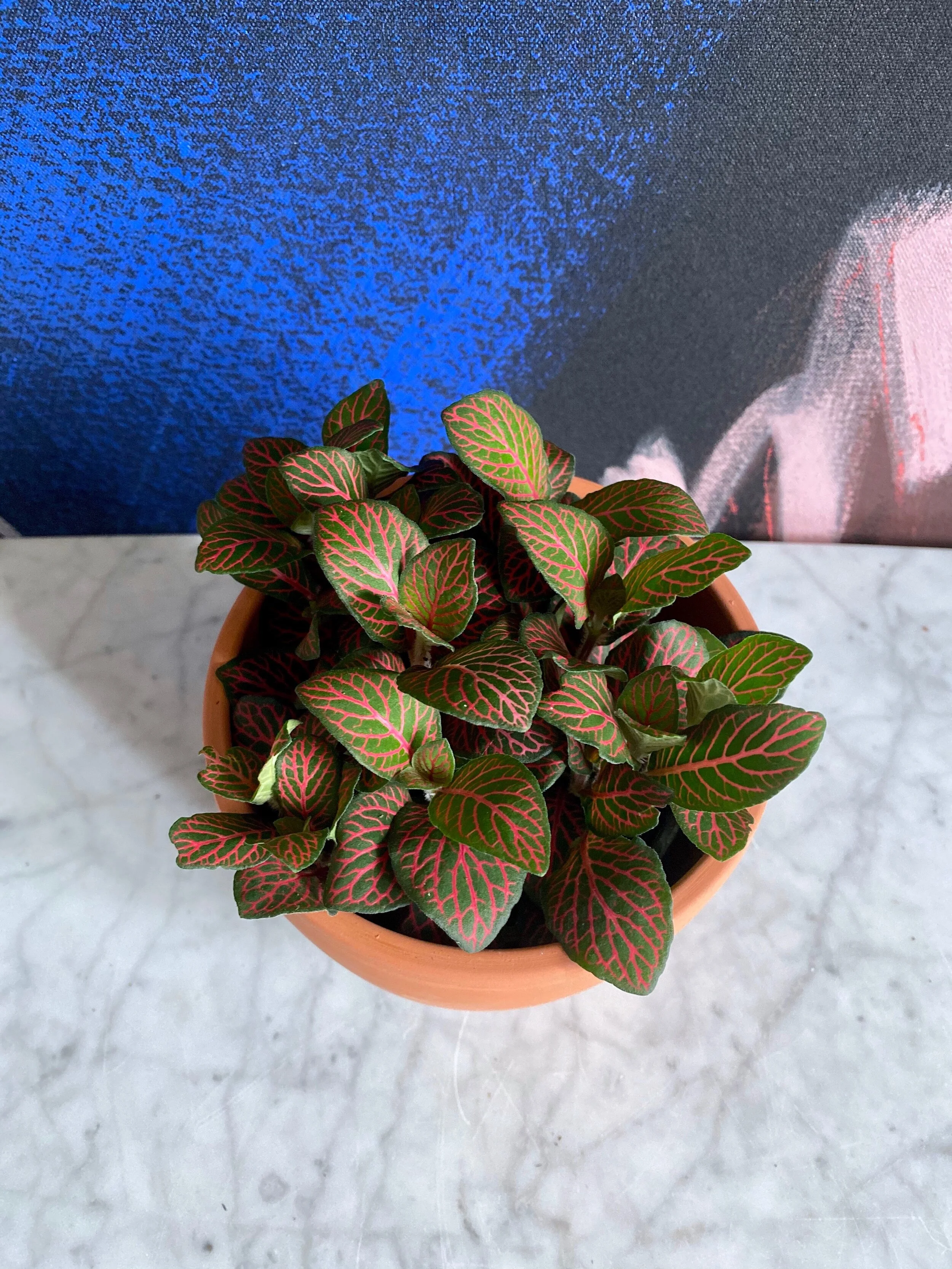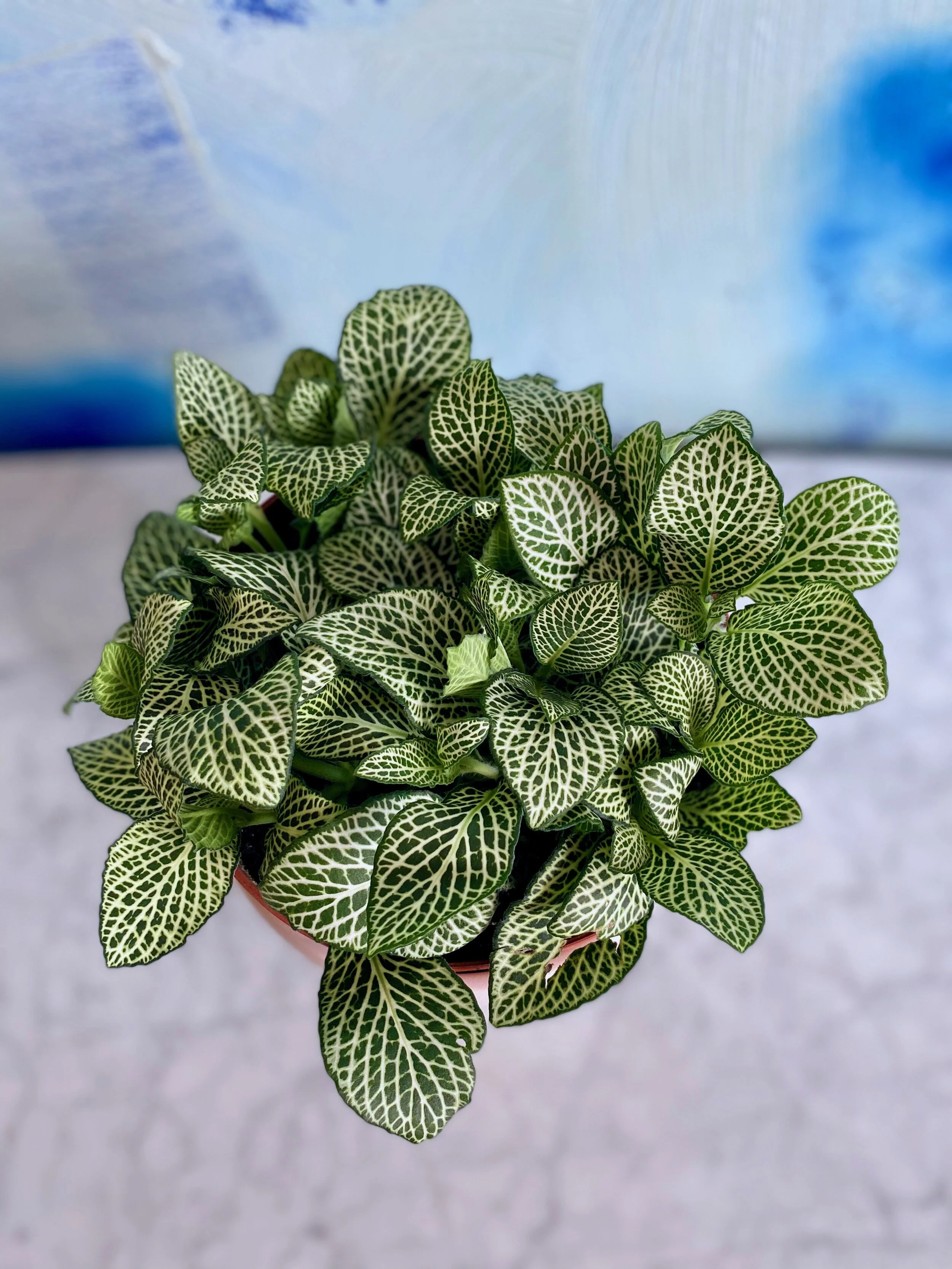 Fittonia argyroneura plants are compact with contrasting elaborate veining. This plant has dark green leaves with white or pink veins.