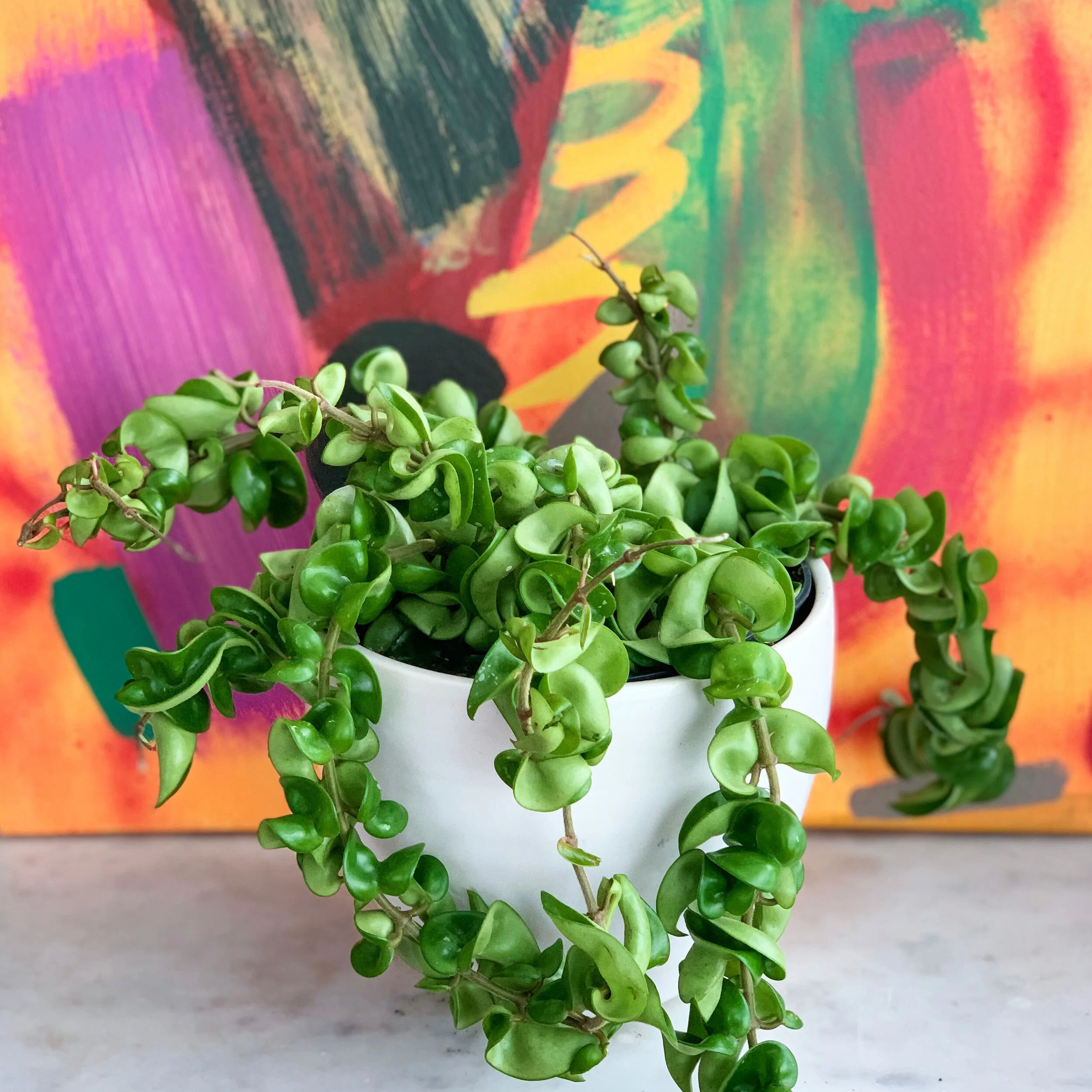 A very rare beautiful trailing plant, the Variegated String of Hearts has thick little heart shaped leaves. Locally grown. The soil has a thick layer of moss growing on top. Suggest repotting in Spring.